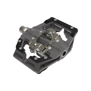 The CNC-machined, ceramic-coated magnesium pedal body (CeraMAG) keeps the weight low at only 419 grams per pair — approximately 210 grams per pedal. It utilizes an ultra-robust forged and CNC-machined chromoly steel axle. The fully serviceable triple-bearings system consists of a LSL self-lubricating bushing, a needle bearing, and an industrial roller bearing. Quad seals keep the internals remain dry in any conditions. The dual-sided clip-in system is compatible with classic SPD cleats. The retention system has an adjustable spring tension to finetune entry and relase, while offering 5 degrees of free float. The large platform around the clip-in system provides a solid shoe support for optimized control and power transfer. The pedal is tested and certified to EFBE EPAC Gravity TRI-TEST® standard (category 5).