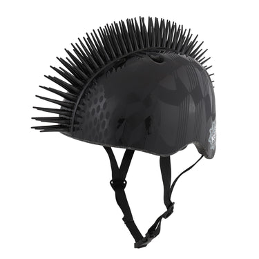 The geometric black matte and gloss graphic pattern of the Krash! Cube Hurt Hawk Fit System helmet is inspired by graffiti street art. The sleek, easy-to-use fit system offers an adjustable, secure fit with a quick turn of the dial and the understated graphics make this 3D multisport bike helmet with a black 2-inch bendable mohawk the perfect helmet for teens to hit the trails, parks and streets in style. The youth size helmet is recommended for riders 8–14 years old, but will fit anyone with a head measuring 54–58 cm.
